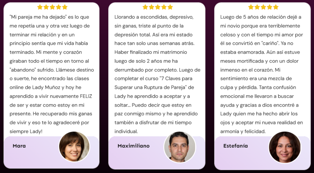 El programa «7 Claves para Superar una Ruptura de Pareja« fue el faro que me guio cuando todo era oscuridad. Si estás list@ para soltar el dolor, recuperar tu autoestima y empezar una nueva etapa en tu vida, este es el momento.